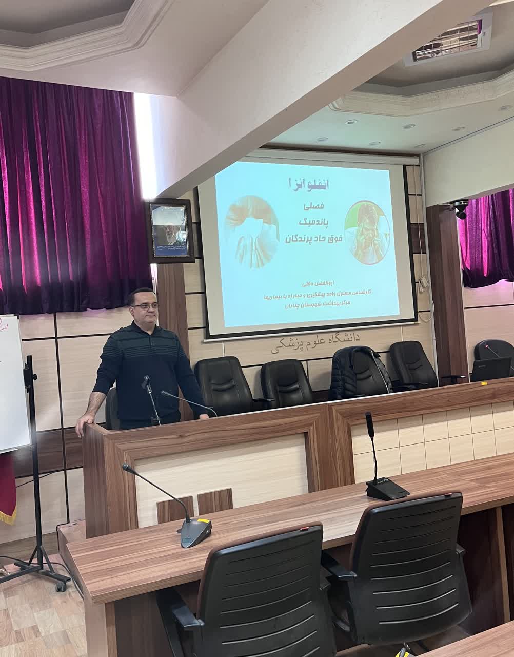 در این جلسه آقای مهندس دقتی مسئول محترم واحد پیشگیری و مبارزه با بیماری ها مطالب آموزشی در خصوص دستورالعمل های بیماری آنفولانزا ، همچنین پیشگیری، تشخیص و درمان این بیماری را به عنوان سخنران ایراد نمودند.