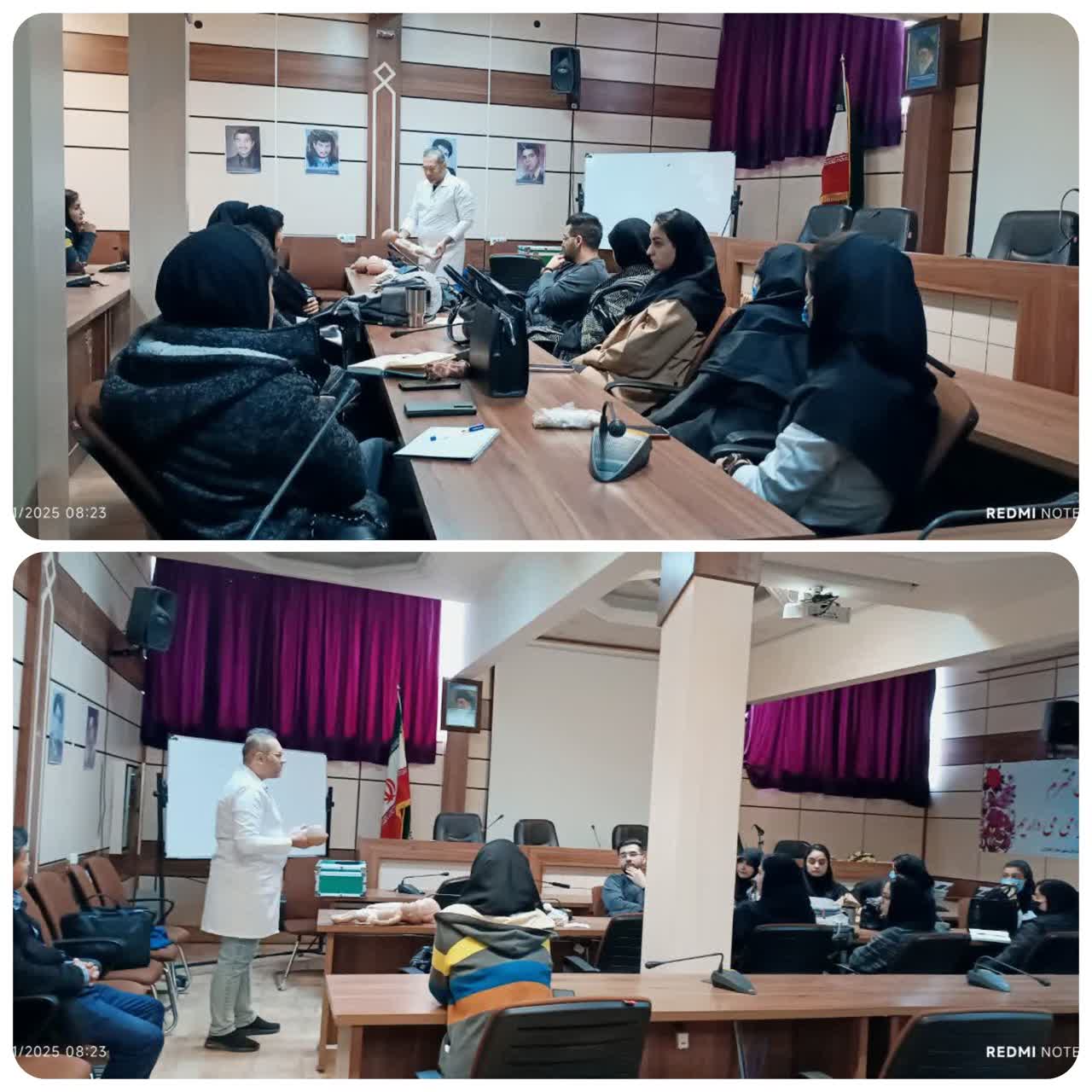 در ادامه این نشست، مدرس این کارگاه ، «آقای محمد وفایی» پرستار بخش Icu بیمارستان، مطالبی در رابطه با پیشگیری از ایست های قلبی و تنفسی، مراحل احیا پایه، رفع انسداد هوایی، برخورد با فرد غرق شده و حادثه دیده، مانور هلمیخ در کودکان بصورت تئوری و عملی آموزش داد.