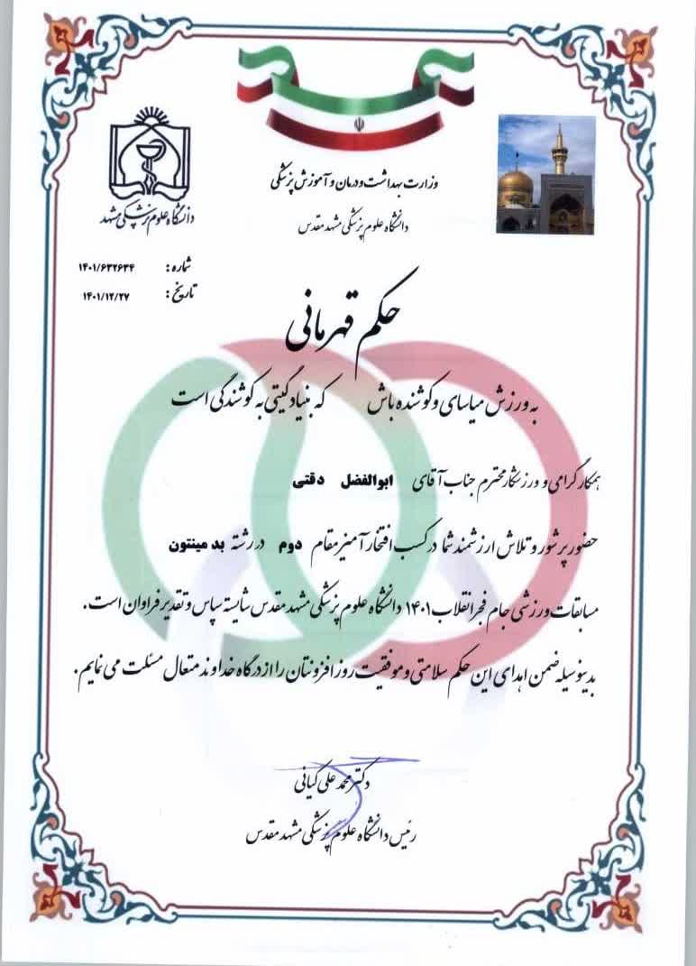 حکم قهرمانی جناب آقای ابوالفضل دقتی موفقیت شما در مسابقات بدمینتون نشان از لیاقت و شایستگی است امید است در تمام مراحل زندگی موفق و موید باشید.