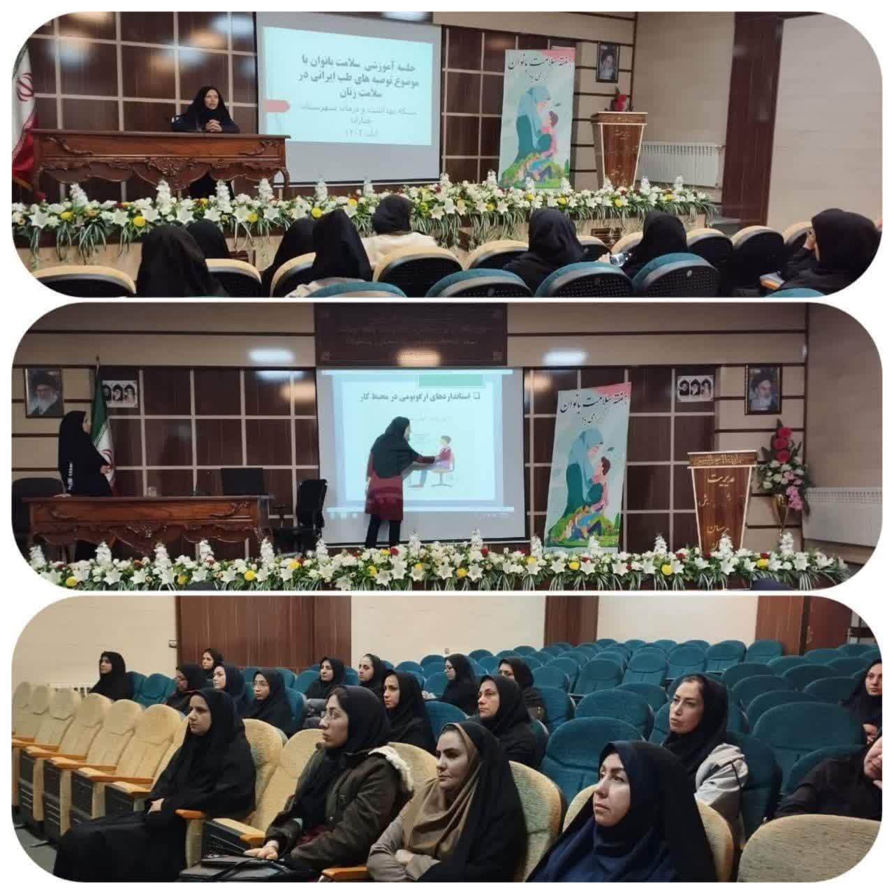 طی این جلسه خانم دلدار مسئول واحد سلامت خانواده ، به توصیه های طب ایرانی در سلامت بانوان وتاثیر باروری و فرزنداوری بر سلامت آنها پرداختند و در ادامه نیز عوارض سقط جنین را بیان نمودند.