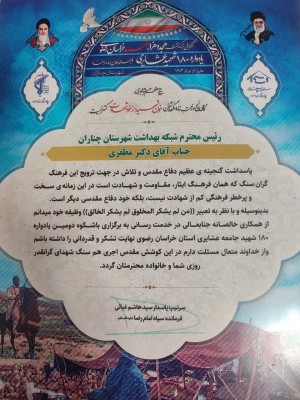 اهدا لوح کنگره ملی بزرگداشت هجده هزار شهید خراسان رضوی به پاسداشت خدمت رسانی در برگزاری باشکوه یادواره 180 شهید عشایری شهرستان چناران از طرف فرمانده سپاه امام رضا (ع) سرتیپ پاسدار سید هاشم غیاثی به مدیر شبکه بهداشت و درمان چناران دکتر یعقوب مظفری گلوگاهی